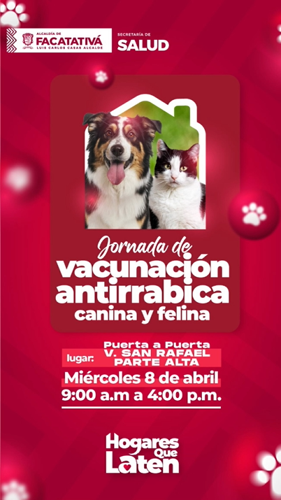 La Alcaldía de Facatativá, desde la Secretaría de Salud y bajo el programa institucional "Hogares Que Laten", invita a los habitantes de la Vereda San Rafael Parte Alta a participar en la jornada de vacunación antirrábica para sus mascotas. Con el fin de facilitar el acceso a este servicio esencial de salud pública, el equipo técnico realizará visitas puerta a puerta para aplicar las dosis correspondientes a caninos y felinos, asegurando la protección de los animales de compañía y el bienestar de todas las familias del sector.